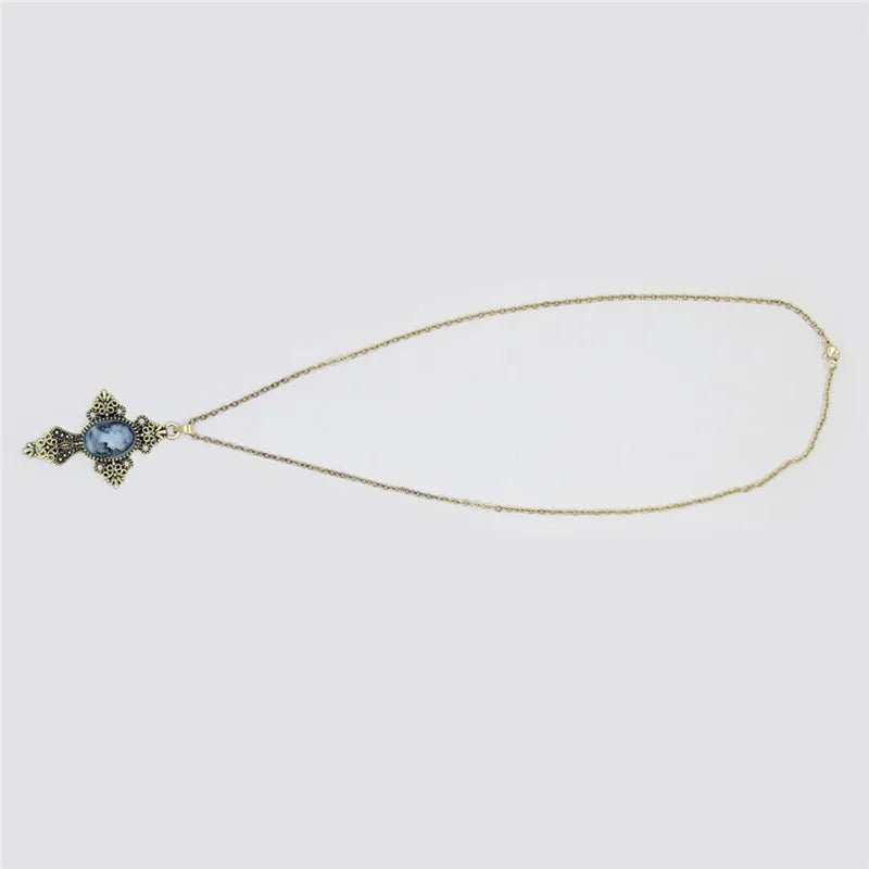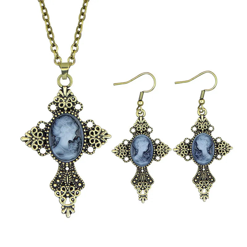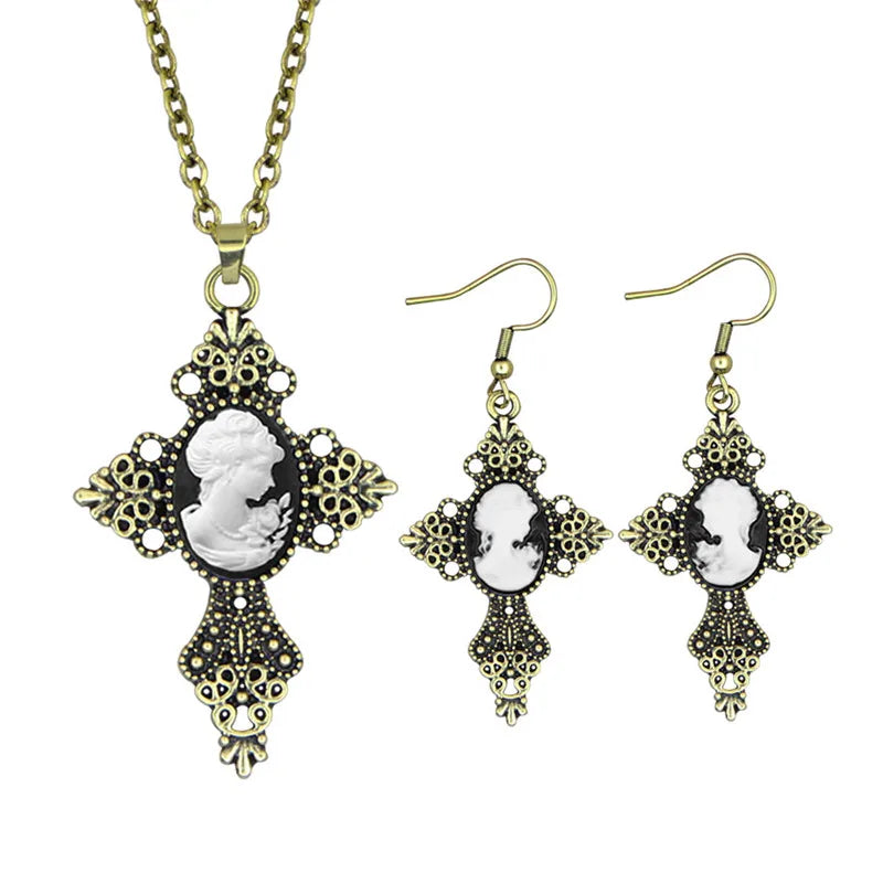 Design Raffiné : L'ensemble présente un motif camée Dame Reine élégant, accentué par un pendentif croix vintage, parfait pour ajouter une touche de sophistication à votre look.